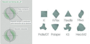 Dentro de las ventajas de este sistema se puede destacar la preparación homogénea de los conductos que conlleva a una irrigación más eficiente y alcanzando un sellado óptimo de los mismos26. El Sistema Profile®, diseñado para dientes permanentes, presenta una conicidad constante del 4% en el cuerpo, un punto inactivo y una zona de corte de triple “U”, con tres áreas lisas en contacto con las paredes del conducto radicular, diseñadas para limpiar, pero no cortar la dentina (Figura 2). Se usa a baja velocidad 150-300 rpm. Se obtienen mejores resultados en la obturación ya que se logra buena conicidad del canal y un menor tiempo de trabajo17. Los instrumentos rotatorios Mtwo® se encuentran entre los sistemas de limas más comúnmente usados para dientes permanentes. Es una nueva generación de instrumentos rotatorios con una sección en forma de S itálica, con dos cuchillos de corte, punta no cortante, conicidad fija y distancia entre estrías de la lima variable (Figura 2).