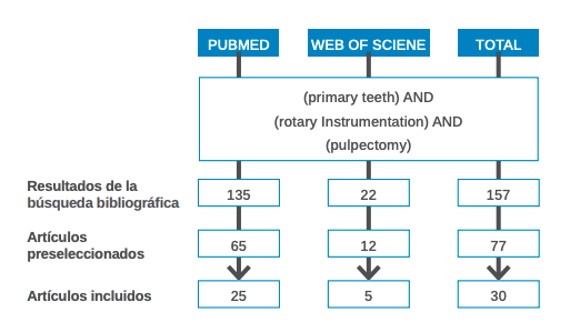 Para la realización de la revisión bibliográfica se llevó a cabo un análisis de la literatura científica publicada en bases de datos como Pubmed, utilizando la estrategia avanzada con los operadores booleanos “AND” y “OR”. Las palabras clave utilizadas fueron: “rotary instrumentation”, “pulpectomy”, “pediatric dentistry”, primary molars”. Se incluyeron en el trabajo todos los artículos que cumplieran con los criterios de inclusión: publicados en inglés o español, fecha de publicación de los últimos 15 años, artículos de revisión sistemática, casos y estudios en humanos. Se excluyeron artículos que no cumplían con los criterios de inclusión.