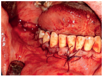 A los 7 días se revisó la herida quirúrgica, mientras que la retirada de puntos se realizó a los 15 días. Al mes se había producido una buena cicatrización de la zona intervenida y aunque el paciente no refirió molestias, si indicó una sensación de parestesia en el labio inferior derecho. (Figuras 12 y 13).