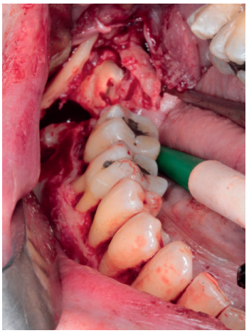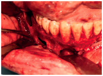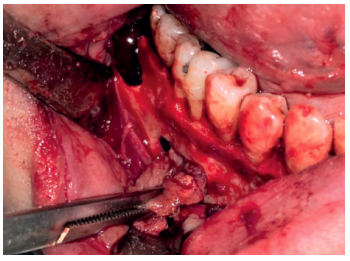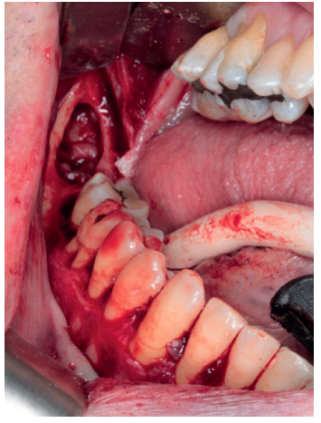 La cirugía se planteó bajo sedación y con el doble objetivo de la eliminación completa de la lesión con el cordal asociado y evitar un debilitamiento excesivo de la mandíbula. Para ello, se realizó un triple acceso a la lesión que nos permitiese por un lado despegar el quiste en toda su extensión mediante el uso de periostotomos y cucharillas de legrado, y por otro lado preservase una serie de “arbotantes” óseos que a su vez permitieran la posterior colocación de una mini placa desde la rama mandibular hasta el cuerpo, que actuase como refuerzo estructural (Figura 4).