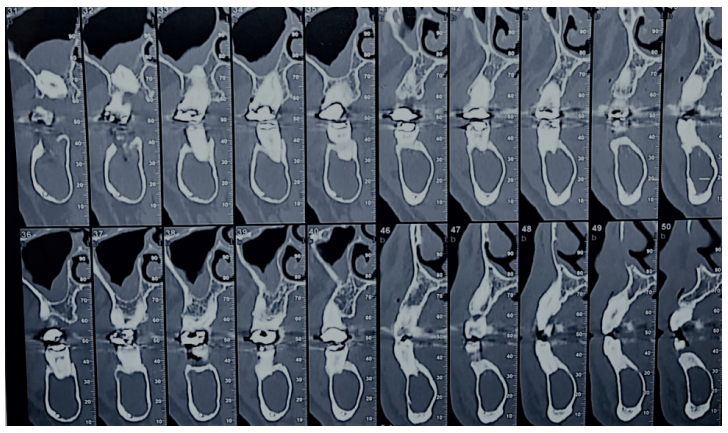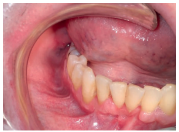 Acudió a servicio de cirugía oral, derivado por su odontólogo, un paciente varón de 65 años sin antecedentes médicos de interés, tras comprobar un importante crecimiento de una imagen radiotransparente respecto a última radiografía de hacía 5 años. El paciente no refirió sintomatología asociada. A la exploración extraoral no se apreció ningún tipo de deformidad ni afectación ganglionar. A la exploración intraoral pese a que se constató la integridad de las corticales, las cuales no estaban abombadas, sí que se pudo apreciar a la palpación un signo positivo de Dupuytren o de “Ping-Pong”. Además se constató una falta de afectación de los dientes del cuarto cuadrante que no presentaban movilidad y tenían una vitalidad positiva (Figura 1). Como complemento a la exploración clínica se solicitó un estudio mediante TAC, donde se apreció la extensión de una lesión radiotransparente que afectaba a rama y cuerpo mandibular derecho. (Figuras 2 y 3).