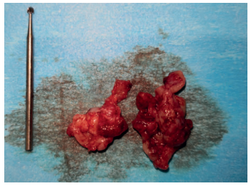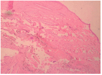 A nivel local, se anestesiaron los nervios alveolar inferior y bucal mediante articaina 40mg/ml con 0.01 mg/ml de epinefrina (Ultracain® , España). Se realizó una incisión intrasulcular a espesor total con una descarga distal alta en la rama mandibular que se extendió hasta distal del canino inferior izquierdo sin necesidad de realizar una descarga en este punto. Se despegó el colgajo con la ayuda de un periostotomo para poder acceder a la superficie ósea. Con pieza de mano y fresa redonda de carburo de tugsteno se realizaron tres cavidades equidistantes: la primera a la altura del trígono retromolar (Figura 5), la segunda apical a los premolares inferiores derechos y la tercera mesio-apical al canino inferior derecho. Dichos accesos permitieron abordar y despegar toda la lesión en su extensión para posteriormente poder traccionar de ella a través de la cavidad media (Figuras 6 y 7). La cavidad posterior sirvió también para realizar la exodoncia del cordal (Figura 8). Tras la eliminación del quiste se llevó a cabo un legrado minucioso de la cavidad remanente y se limpió con agua oxigenada. A continuación, se colocó la mini placa con una extensión desde la rama mandibular hasta mesial de la cavidad media. Por último, se reposicionó el colgajo y se suturó de forma hermética mediante una sutura poliamida recubierta no reabsorbible de 4/0 Supramid (Aragó® ) (Figura 9). La muestra obtenida se conservó en formaldehido al 10% y se envió al anatomopatólogo, el cual confirmó el diagnóstico de quiste dentígero sin displasia celular (Figuras 10 y 11).
