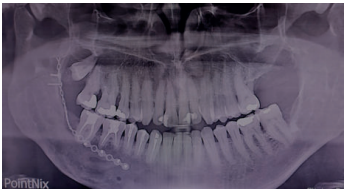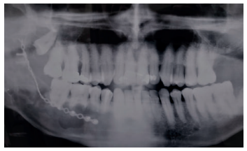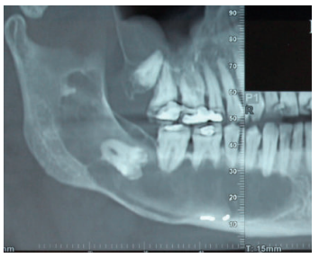 Dicha sensación de parestesia todavía perduraba en la última revisión realizada a los seis meses después de la intervención, momento en que se realizó una nueva radiografía panorámica. En ella se aprecia una buena osificación del gran defecto remanente (Figura 14).