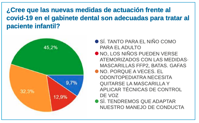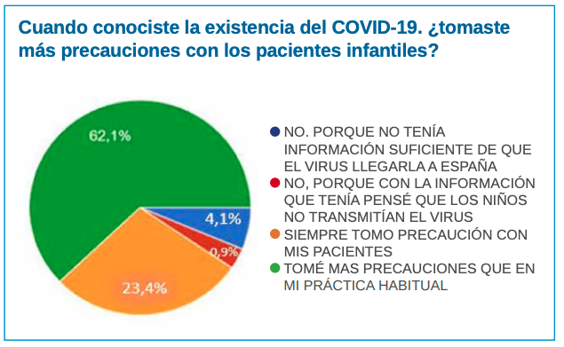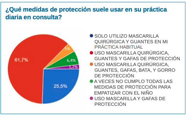 Tras el conocimiento de la existencia de la pandemia, un 61,7% de los encuestados reconoció que tomó más medidas de protección de las que tomaba de forma habitual. El manejo de la conducta de los pacientes pediátricos, utilizando todas estas medidas de protección puede verse alterado, puesto que dificultan la comunicación y la transmisión de emociones a través de los gestos desde el odontopediatra hacia el niño. De hecho, un 45% aproximadamente de los encuestados hacen referencia a que estas nuevas medidas de protección no son adecuadas en odontopediatría por el temor que pueden sentir los niños o porque a veces es necesario quitar la mascarilla para aplicar técnicas de manejo de la conducta mediante el control de voz. Sin embargo, será necesario adaptarse a las nuevas circunstancias de trabajo dada la alta tasa de infección del SARS-CoV-2 y a la capacidad de infectar en periodos asintomáticos.