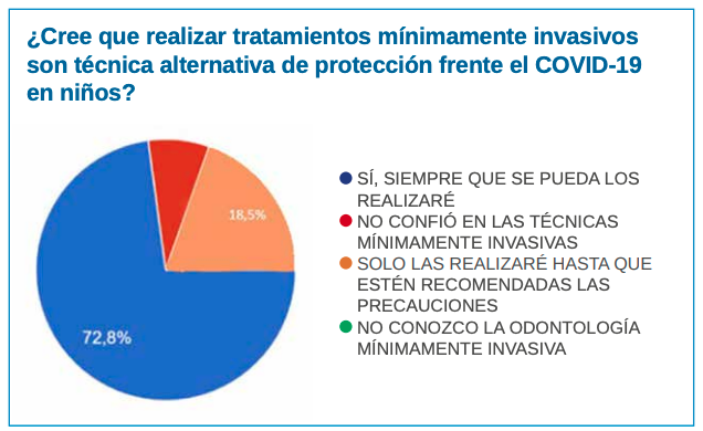 Se preguntó al encuestado si pensaba que realizar tratamientos mínimamente invasivos son técnicas alternativas de protección frente al COVID-19 en niños; el 72,8% respondió que sí lo cree y las realizará siempre que pueda. Un 18,5% respondió que solo las realizará hasta que el Colegio de Odontólogos recomiende las precauciones para evitar posibles contagios. El 7,6% respondió que no confiaba en las técnicas mínimamente invasivas (Figura 3).