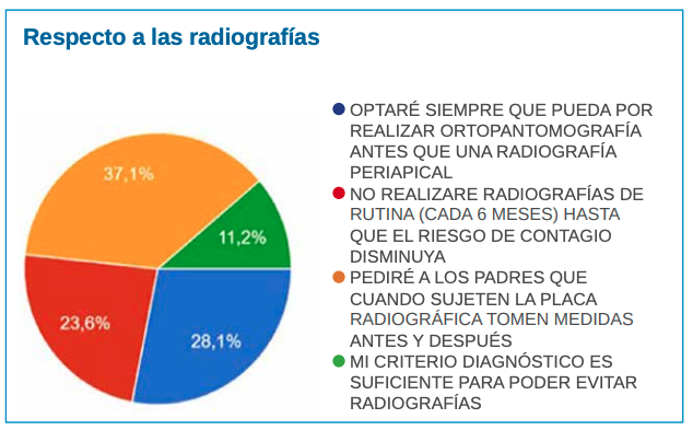 El Consejo General de Dentistas de España aconseja priorizar las radiografías extraorales frente a las intraorales como método complementario de diagnóstico, por el hecho de que hay menos riesgo de contaminación al tener menos contacto de saliva con la aparatología radiográfica de la técnica extraoral que con la intraoral. Entre los encuestados, casi el 30% realizarán, principalmente, ortopantomografías antes que radiografías periapicales, mientras que casi un 25% opta por no hacer ninguna placa radiográfica en al menos 6 meses hasta que el riesgo de contagio disminuya. Si bien es verdad que las técnicas extraorales no sustituyen a las intraorales en el diagnóstico de caries, más del 55% de los encuestados en total prescindirían de realizar radiografías intraorales20.