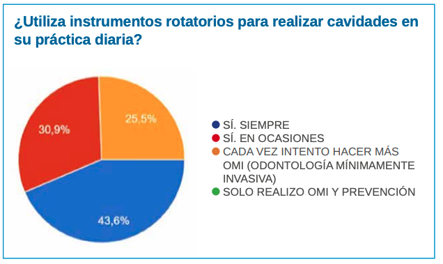 Respecto a la pregunta sobre el uso de instrumentos rotatorios para realizar las cavidades en el paciente infantil, todos los encuestados señalaron que los utilizan, aunque se ve reflejado un porcentaje significativo (25,5%) que realizan cada vez más odontología mínimanente invasiva (Figura 2).