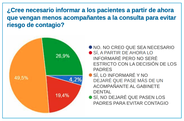Finalmente, en cuanto a la presencia de acompañantes, casi el 50% de los encuestados afirma que informará al paciente de que tienen que venir menos acompañantes con el menor y que solo dejará pasar a uno a la zona de trabajo. Las recomendaciones actuales de las autoridades competentes son que solo un adulto puede acompañar al paciente menor a la clínica dental. Se aconseja que no pase a la zona clínica, pero a veces es necesaria esa presencia en el gabinete para controlar los niveles de ansiedad del niño. En estos casos, el adulto tiene que entrar con sistemas de protección (gorro, calzas y lavado de manos con gel hidroalcohólico) y quedarse a 2 metros de la zona de trabajo. Esto puede suponer un problema a la hora de tratar a los niños de más corta edad puesto que el contacto físico con su padre o madre puede ayudar a rebajar su nivel de estrés. Sin embargo, el 19,4% informará a los pacientes pero no será estricto con la decisión que tomen.