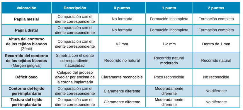 El WES se enfoca en la parte de la corona del implante que emerge de la mucosa peri-implantaria, para ello se basa en cinco parámetros: forma de diente, volumen de la corona clínica, color (incluye la evaluación de la tonalidad y el valor de la dimensión), textura y translucidez de la superficie y caracterización. Tanto el PES como el WES asignan una puntuación de 0, 1 ó 2 a los parámetros establecidos (Tabla 1). En casos óptimos se obtienen resultados de 14 para el PES y 10 para el WES. Los cinco parámetros se evalúan por comparación directa con el diente de referencia natural contralateral, estimando así el grado de coincidencia o diferencia existente. Por lo tanto, la combinación más alta del PES/WES es una puntuación de 24, que representa una coincidencia cercana de las condiciones de los tejidos blandos peri-implantarios y la clínica de la corona sobre implante, en comparación con las características respectivas del diente natural contralateral7.