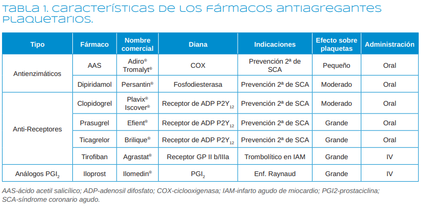 acetilsalicílico) o la fosfodiesterasa (dipiridamol), en bloquear el receptor P2Y12 plaquetario (como las tienopiridinas) o el receptor GP IIb/III a (como el tirofiban) o en actuar como análogos de moléculas que inhiben la agregación plaquetaria (como el iloprost) (Tabla 1).