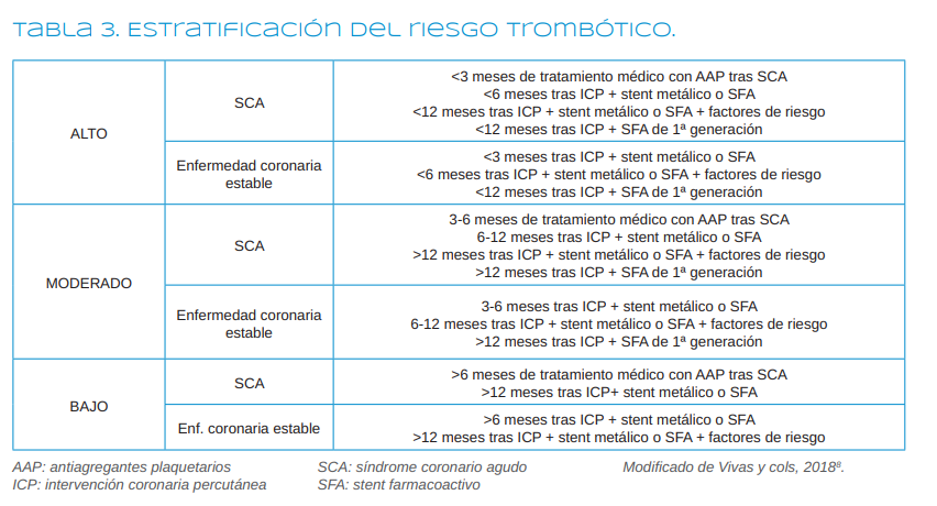 - Si el riesgo trombótico es moderado (por ejemplo, un paciente que es portador de un stent que lleva colocado entre 6 y 12 meses), siguiendo a la Sociedad Española de Cardiología, lo ideal es esperar a que el riesgo trombótico sea bajo8