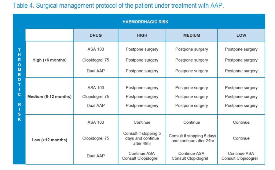 In general, without having to consult the cardiologist for the type of stent, the thrombotic risk can be summarized as: high if less than 6 months have passed since the implantation of any type of stent; medium risk, if 6 to 12 months have passed since the implantation of any type of stent; and low risk, if more than 12 months have passed since the implantation of any stent or if it does not have a stent.