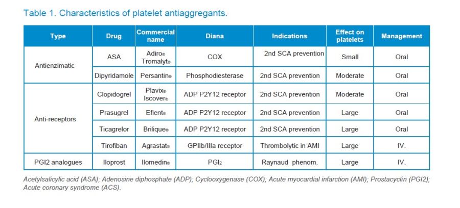 Antiplatelet agents (APAs) are drugs that inhibit platelet aggregation, acting as antithrombotics. They usually act irreversibly and their function cannot be monitored, but it is usually considered that their effect lasts as long as the average life of the platelet, that is, between 7 and 10 days1. The main indications of these drugs include acute coronary syndromes (ACS) (which include acute myocardial infarction-AMI and unstable angina), stable coronary artery disease, cerebrovascular disease, and peripheral artery disease, but they are also used after surgical treatments that are performed after the appearance of these conditions, such as percutaneous coronary intervention (PCI) or revascularization surgery, and in the prevention of recurrence of the same, that is, in the secondary prophylaxis of atherosclerotic disease1.
