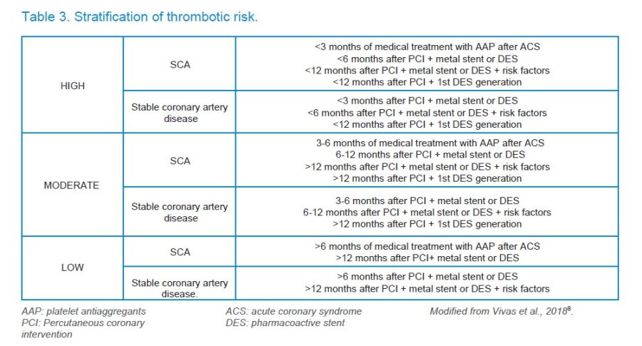 Patients with a stent are at higher risk of thromboembolic complications than those with a stable coronary artery disease7,14, especially when a drug-eluting stent or pharmacoactive stent (DES) has been inserted, especially the first generation, which are associated with a higher thrombosis possibility than the second generation, which have improved their safety profile8. According to Vivas et al.8, (2018), a high thrombotic risk has been reported when less than 3 months of ACS have passed and is only under medical treatment (especially during the first month) or less than 6 months from the implantation of a second generation DES or less than 12 months from the first generation DES. The thrombotic risk will be moderate when 3 to 6 months have passed after the ACS under medical treatment, between 6 and 12 months after placement of second-generation ACS or more than one year of first-generation ACS. Thrombotic risk is considered low if more than 6 months of ACS under medical treatment or more than one year since the placement of second-generation ACS8 (Table 3) have passed.
