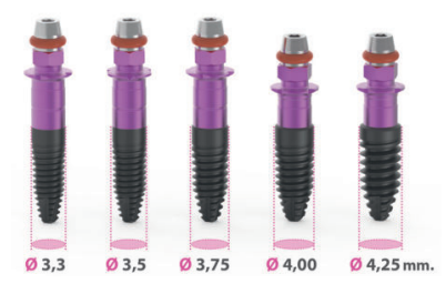 El diámetro de este implante abarca una familia desde 3,3 hasta 4,25 mm, permitiendo de este modo el cambio de plataforma desde el implante de 3,75 mm, existiendo diferentes longitudes en todos ellos para adaptarnos a las diferentes situaciones clínicas (Figura 1).