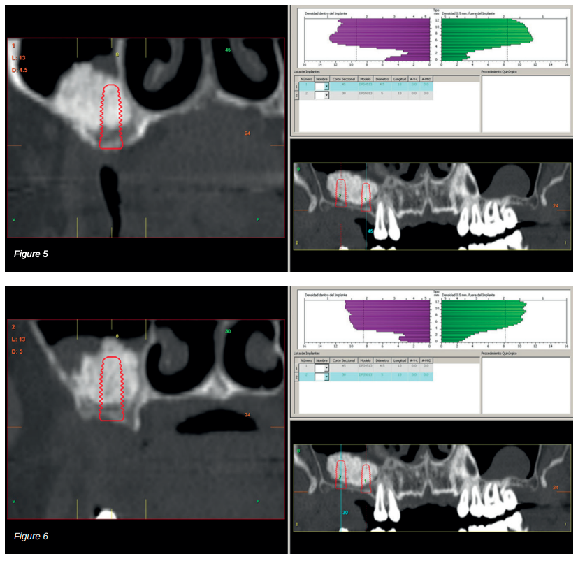 Therefore, it was decided to carry out a sinus lift using biomaterial (bovine hydroxyapatite) bound to PRGFEndoret. The elevation was performed and after five months a new dental cone beam displayed the quantity and quality of the graft obtained for the insertion of dental implants. In the cuts corresponding to the molars of the first quadrant, we observed excellent consolidation of the graft with space to insert 13 mm implants. Today, we would not choose this implant length, since studies published by our group with short and extra-short implants support their use, in addition to showing their diameter is more important than the length to distribute the loads of an already integrated implant; where an 8.5 mm length implant would work in the same way as a 13 mm implant of the same diameter18.