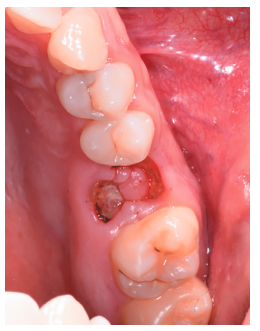 Tras obtener el consentimiento informado, se realizó un bloqueo anestésico mediante Articaína al 4% con adrenalina 1:100.000 (Ultracain®, Normon SL, Madrid, España) del nervio alveolar superior posterior y medio, y palatino anterior. Se realizó la extracción de forma atraumática de los restos radiculares del 2.6 y el legrado del proceso apical (Figura 6), dejando el alveolo del 2.6 preparado para recibir el autotrasplante del 2.8 (Figura 7).