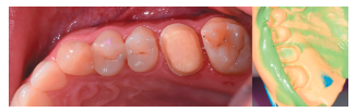 A los 5 meses se talló el diente autotrasplantado en sus caras oclusal, vestibular, palatina e interproximales, para tomar después una doble impresión de silicona pesada y fluida en un paso (Elite HD®, Zhermack, Rovigo, Italia), y posteriormente pedir al laboratorio una incrustación de disilicato de litio (Figura 21).