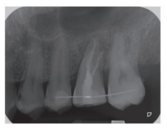 Figura 16. Radiografía periapical paralelizada a las 3 semanas del autotrasplante, coincidiendo con el tratamiento de conductos.