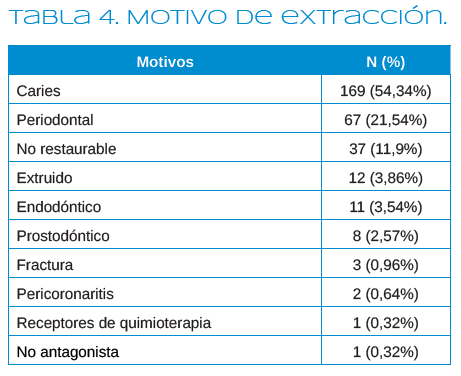 Villares López DE, Rosado Olarán JI, Villares Rodríguez JE, González González AI, Rodríguez Barrientos R. Análisis de las causas de exodoncia en dentición permanente en pacientes que acuden a la consulta de odontología de un Centro de Salud de Atención Primaria. Cient Dent 2015;12:6–14.