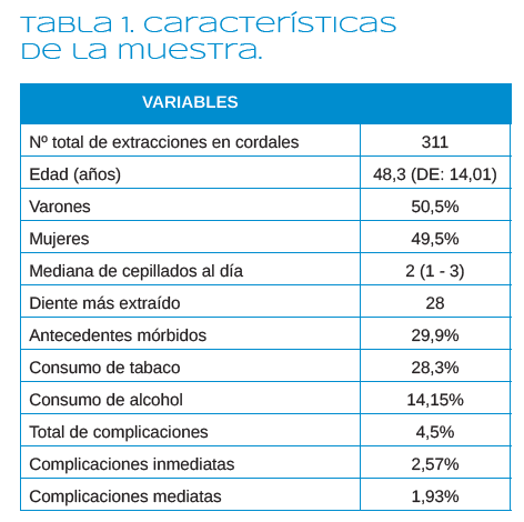 La extracción puede ser un tratamiento sencillo, pero también puede llevar a grandes complicaciones, presentando una tasa de entre el 5 y el 18,5%4,5 descriptivo, con el uso del registro prospectivo de la totalidad de pacientes ingresados para cirugía bucal del Complejo Hospitalario San Borja-Arriarán durante doce meses de observación (abril 2017 a marzo 2018. Las complicaciones inmediatas ocurren durante el acto quirúrgico y destacan las producidas por la anestesia, fractura de corona o raíz, lesiones de tejidos blandos e incluso la equivocación en el diente a extraer. Las complicaciones mediatas suceden de forma secundaria, horas o días después del tratamiento.