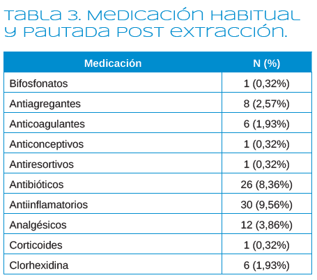 A total of 311 extractions of erupted third molars performed between the years 2018-2020 by students of the polyclinic of the European University of Madrid were analyzed. Age, sex, extracted tooth, habits, diseases, regular medication, medication prescribed by the operator, reason for extraction, periodontal status and complications were recorded. Data analysis was performed with the Stata IC v. 15 statistical package.