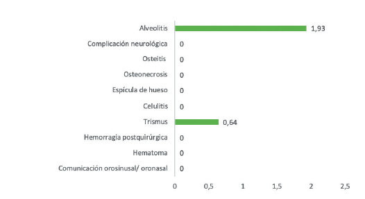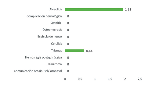 Pueden ser de naturaleza local o general. Dentro de las locales destacan las infecciosas como la alveolitis, osteítis, osteonecrosis, abscesos, celulitis, trismus o sinusitis. También pueden ocurrir hemorragias y hematomas, sobre todo en pacientes anticoagulados y antiagregados, así como comunicaciones buconasales y bucosinusales6. Dentro de las complicaciones mediatas más comunes, se encuentra la alveolitis con una frecuencia que varía desde el 2,5 y el 8%4,7 descriptivo, con el uso del registro prospectivo de la totalidad de pacientes ingresados para cirugía bucal del Complejo Hospitalario San Borja-Arriarán durante doce meses de observación (abril 2017 a marzo 2018, seguida de la hemorragia intraquirúrgica4descriptivo, con el uso del registro prospectivo de la totalidad de pacientes ingresa- dos para cirugía bucal del Complejo Hospitalario San Borja Arriarán durante doce meses de observación (abril 2017 a marzo 2018.
