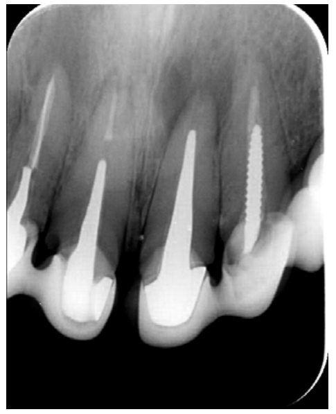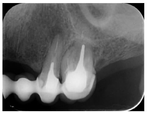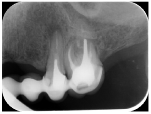 The intracanal posts in the single-root teeth in our case, whose removal would have entailed the sacrifice of the scarce remaining tooth that could remain under the metal ceramic crowns, made us opt for periapical surgery on these teeth. However, tooth 26 was underfilled by several millimetres in the buccal roots and the CBCT showed an omitted MP canal, so we opted for nonsurgical root canal retreatment in this tooth.