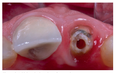 After anaesthetic infiltration (4% articaine with 1: 100,000 adrenaline), the root of the affected tooth was extracted. As a complication of the extraction, the distal papilla was lacerated, which was repaired with a single stitch. The residual socket was then evaluated to prepare the bed to insert the OII. This was intact, with intact vestibular cortex.