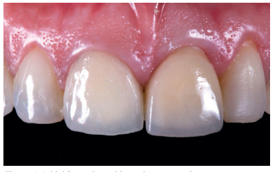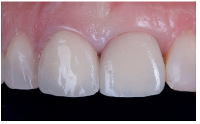 The provisional was removed after 14 weeks, when the gingival margin was seen to be correctly positioned, along with 100% coverage of the recession, complete papillae maintenance and a correct emergence profile (Figures 14 and 15). However, from an occlusion view, there was a lack of buccal volume with respect to the adjacent tooth. Work began with the provisional crown, with progressive increases of composite in the subcritical profile, until a volume similar to tooth 1.1 was achieved. These increases were performed every 15 days (Figure 16)13.