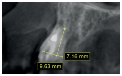 The patient reported pain when chewing in the anterosuperior sector, located in the ICSI area, which disappeared after taking painkillers. An intraoral clinical examination revealed that the decemented crown retained remains of the ICSI stump, as well as a cast post that served as a scaffold for the restoration. The ICSI was a root remnant, with total loss of tooth structure and no ferrule that might ensure a new rehabilitation9 . The patient had a medium smile line and a fine gingival phenotype, which was accompanied by gingival recession in the affected tooth, as well as in the contiguous teeth of the second quadrant. She presented palpation, percussion and a positive bite test and negative vitality in the ICSI, with no periodontal pocket (probe depth < 3 mm) or mobility. An additional radiological examination was carried out, which included a periapical radiograph and cone beam computed tomography (CBCT), see Figure 4. After evaluating these tests, a subgingival complete horizontal coronary fracture without periapical bone involvement was observed.