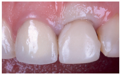 This describes the clinical case of a 52-year-old woman who came to the dentist surgery due to de-cementation of a tooth-supported metal-ceramic crown on tooth 2.1 (ICSI), see Figures 1-3. The patient reported it as of high concern for her aesthetically.