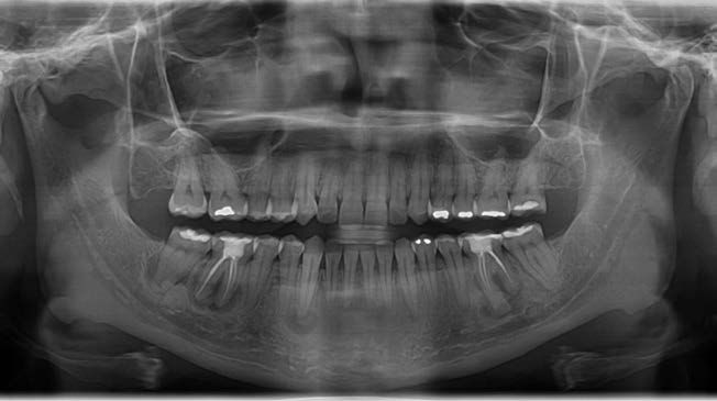En una radiografía panorámica del año 2018 (Figura 1) se observaron lesiones difusas en la mandíbula, localizadas en las regiones periapicales de los dientes 36, 43, 46 y 47. Estas lesiones presentaban un predominio de áreas radiotransparentes, con la presencia de pequeñas zonas de material radiodenso.