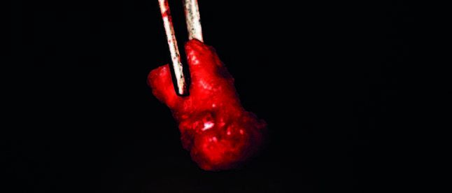 La raíz mesial presentaba un material adherido que tenía una consistencia heterogénea (Figura 5). En el fondo del alveolo, se observó tejido que se desprendía fácilmente, caracterizado por un material igualmente heterogéneo, consistente en tejido fibroso intercalado con zonas de mayor densidad, compatibles con una osificación parcial en desarrollo. Este material junto a las raíces se remitió para su análisis histopatológico.