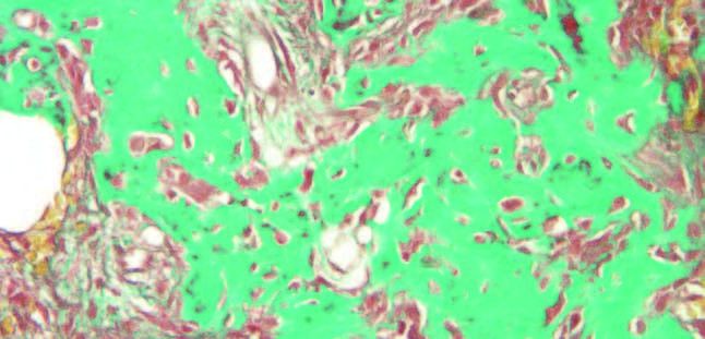 El análisis mediante tinciones de Hematoxilina-Eosina y Tricrómico de Masson, mostró una lesión fibro-ósea constituida por tejido conectivo fibroso con abundante celularidad fusiforme que rodeaba fragmentos trabeculares de tejido cemento-óseo vital con aposición celular blástica externa y clástica multinuclear, lo que confirma el diagnóstico de DCOF (Figuras 6 y 7).