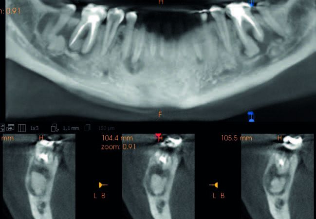 Las radiografías panorámicas e intraorales permiten un examen limitado de las estructuras anatómicas adyacentes. La tomografía computarizada de haz cónico (CBCT) permite una evaluación tridimensional (3D) de las estructuras anatómicas con una distorsión mínima y una alta resolución espacial, de ahí que resulte bastante beneficiosa para la detección de DCO10,11.