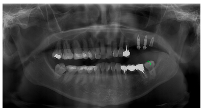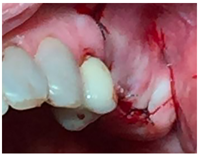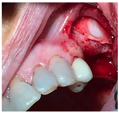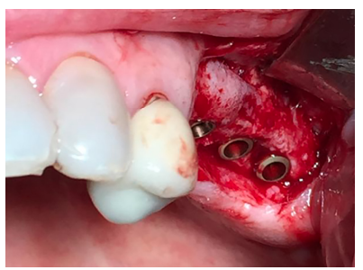 The sinus lift was performed with b-TCP as graft material. After three months, three implants were placed, acquiring a good primary stability