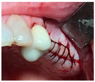 Se realizó la elevación sinusal con b-TCP como material de injerto. Pasados tres meses, se procedió a la colocación de tres implantes, adquiriendo estos una buena estabilidad primaria.