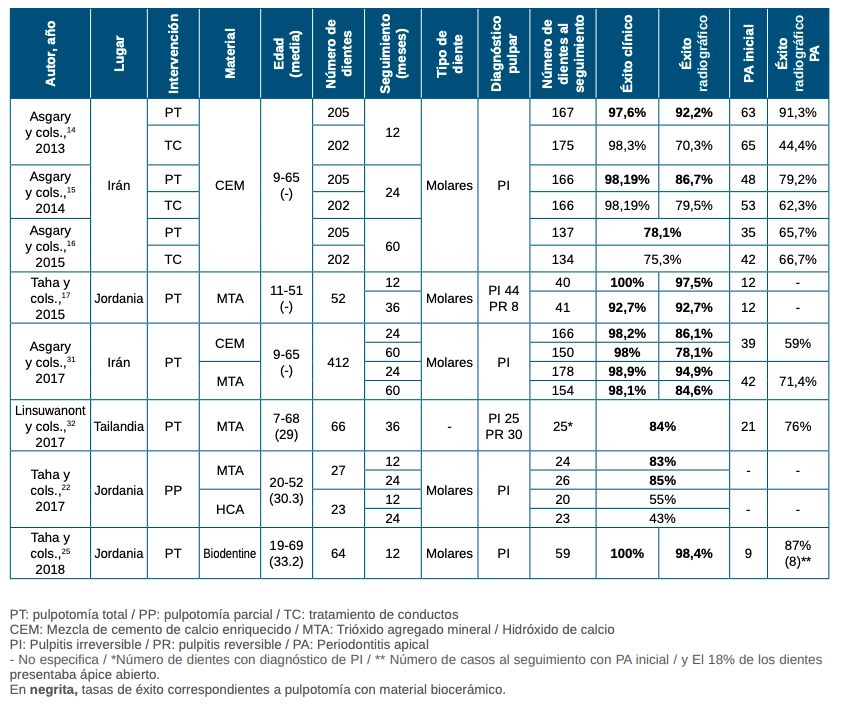 Cushley S, Duncan HF, Lappin MJ y cols. Pulpotomy for mature carious teeth with symptoms of irreversible pulpitis: a systematic review. J Dent 2019; 88: 103- 58.