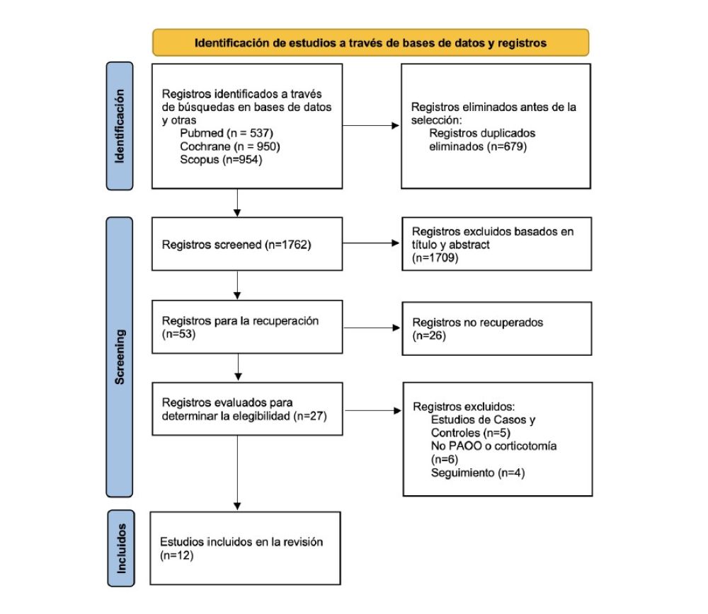 Se realizó una búsqueda electrónica en las bases de datos PubMed, Cochrane y Scopus, incluyendo estudios publicados en los últimos 10 años. La estrategia de búsqueda se adaptó a cada base de datos y fue la siguiente: (corticotomy) OR (periodontally accelerated orthodontics) OR (PAOO) OR (grafting) OR (augmented)) AND ((orthodontics) OR (orthodontic)).