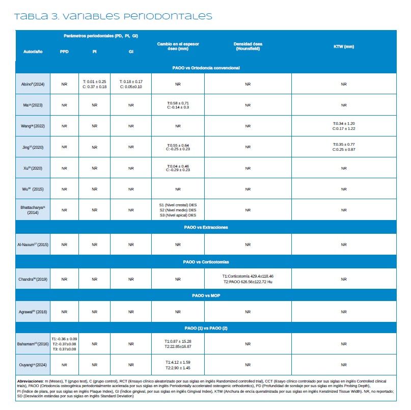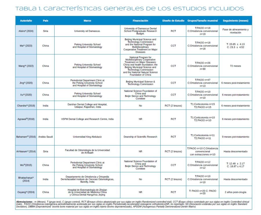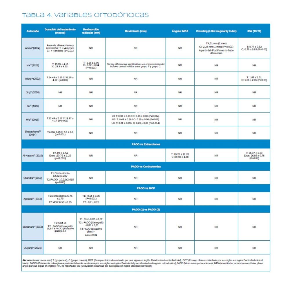 Resultados: Se incluyeron un total de 12 estudios (7 ECA y 5 ECC). PAOO mostró una reducción significativa en la duración del tratamiento, con beneficios en las dimensiones de los tejidos duros y blandos. Sin embargo, los datos sobre la reabsorción radicular y la estabilidad a largo plazo fueron inconsistentes.