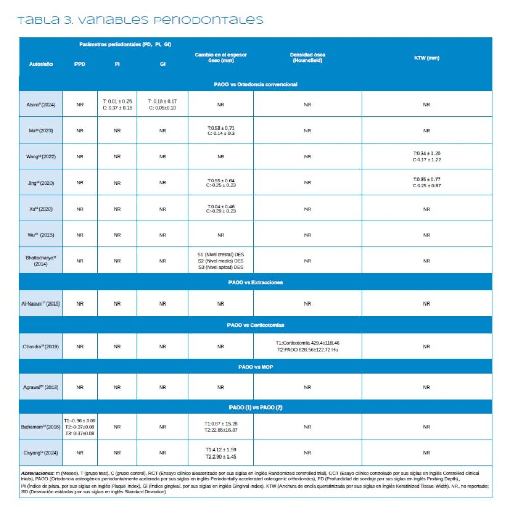 No se observaron diferencias significativas en el índice de placa (IP), índice gingival (IG) ni en la profundidad de sondaje (PS) entre los tratamientos con PAOO y la ortodoncia convencional. A excepción de un estudio9, que observó un aumento del IG en el grupo PAOO.