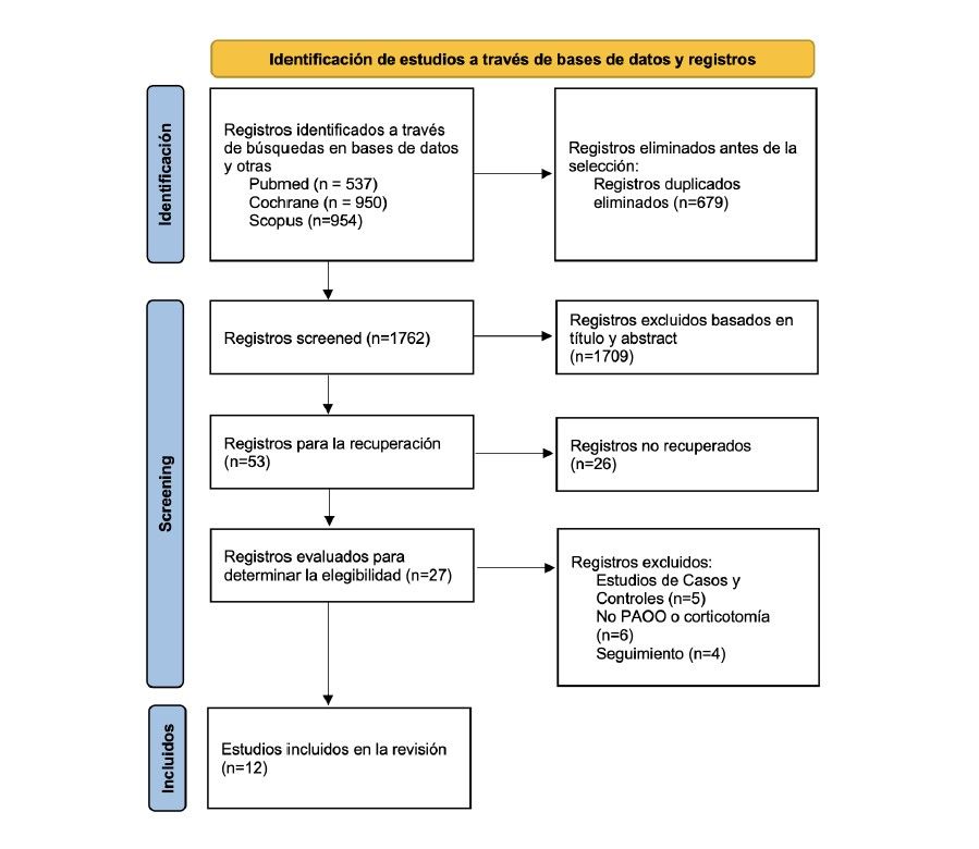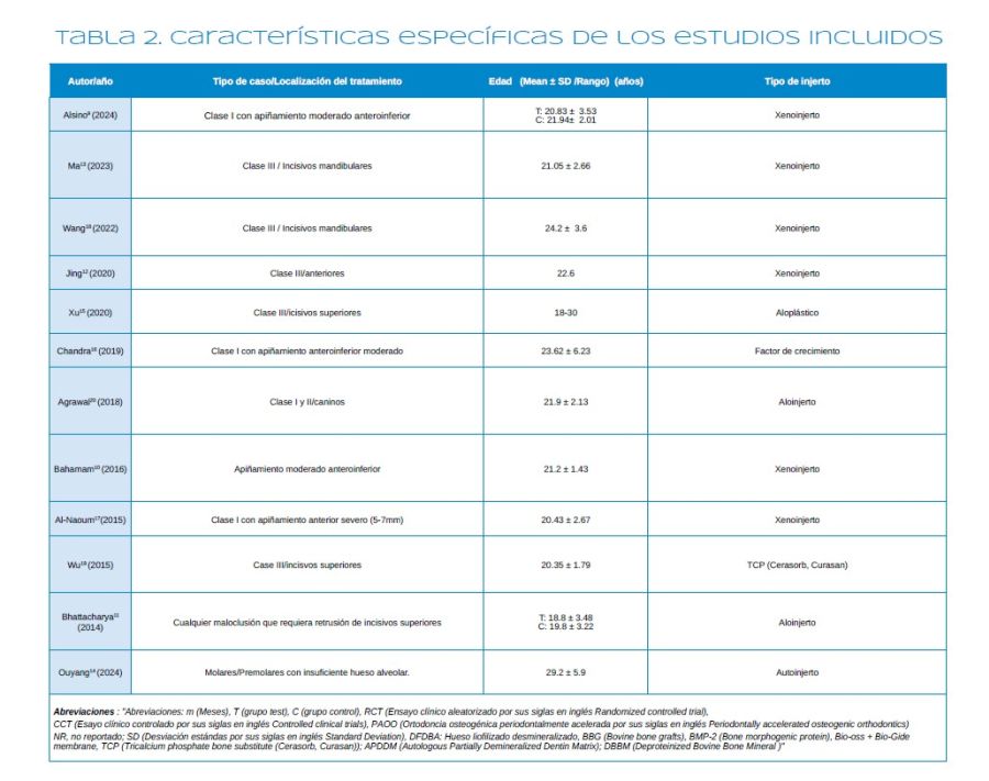 Métodos: Se realizó una búsqueda electrónica en las bases de datos PubMed, Scopus y Cochrane (2014-2024) de ensayos clínicos aleatorizados (ECA) y controlados (ECC) que comparaban PAOO con ortodoncia convencional, corticotomías y diferentes materiales de injerto en pacientes adultos (>18 años) con un seguimiento mínimo de 6 meses. Se evaluó la calidad metodológica y el riesgo de sesgo mediante la herramienta Cochrane RoB 2.0 y ROBINS-I.