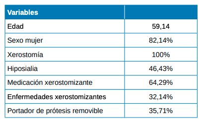 Se incluyeron un total de 28 participantes con sensación subjetiva de boca seca (xerostomía), de los cuales 23 fueron mujeres (82,14%) y 5 hombres. La edad media fue 59,14 años (DE = 14,29), el más joven 27 años y el mayor 79.
