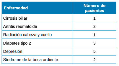 Además del Síndrome de Sjögren, otras enfermedades más frecuentes cuentan con la xerostomía en su sintomatología como la diabetes o la depresión, incrementado este síntoma con la medicación pautada como es el caso de esta última o el Parkinson no controlado6-8. Incluso ciertos tratamientos, como la radiación de cabeza y cuello presentan este tipo de efecto secundario en la mayoría de los pacientes que lo reciben9,10.