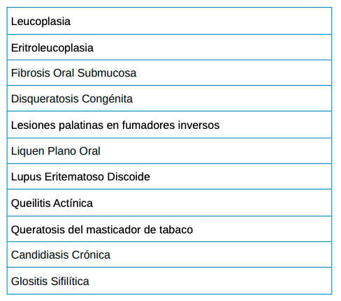 Debe de hacerse una especial asociación entre lo que es el examen intraoral y las lesiones de aparición tempranas, que pueden transformarse en carcinoma oral de células escamosas (COCE), en sus estadios más iniciales. El examen oral es una parte esencial de la atención odontológica multidisciplinar, llevándose a cabo según la guía que proporciona la OMS3 , por los alumnos del Grado en Odontología de la Universidad Europea a todos los pacientes que acuden a la Policlínica Universitaria. Durante la exploración se deben diferenciar los distintos tipos de lesiones orales para lo cual es necesario conocer la etiología, manifestaciones clínicas, localización, tamaño, color y hacer uso de diferentes métodos complementarios como la biopsia para hacer diagnósticos diferenciales, siendo éste el método más utilizado para el reconocimiento de displasias.