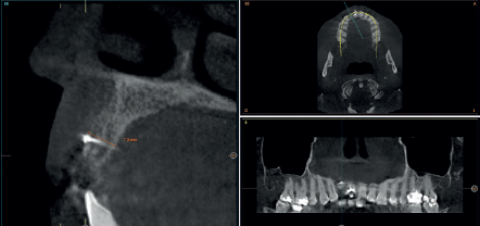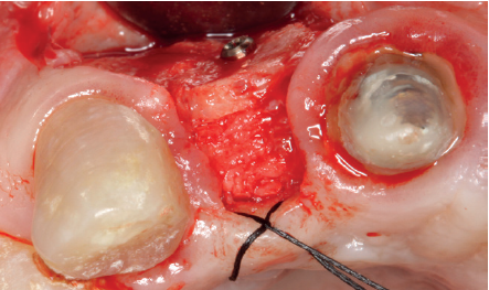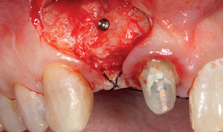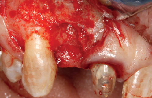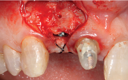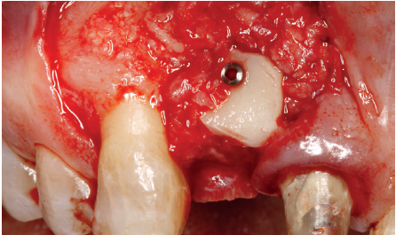 Cuatro meses después, se realiza un nuevo Cone-Beam dental para poder cuantificar la ganancia obtenida en anchura con el procedimiento regenerativo. Se observa en el corte seccional como se ha logrado una anchura de cresta de más de 7 mm y una regeneración completa del reborde alveolar, lo que permite la inserción de un nuevo implante dental en la posición adecuada (Figura 10). En la reentrada quirúrgica se constata la información del Cone-Beam con una integración total del material de injerto, tal como se muestra en las imágenes clínicas en el momento de la elevación del colgajo para la inserción del implante (Figuras 11 y 12). Se procede a la retirada del microtornillo y la colocación del implante, que se realiza mediante la compresión vestibular del injerto para ganar de esta manera aún más contorno en esta área (Figura 13). El implante se deja en una fase quirúrgica, con un pilar de cicatrización bajo que permita una localización posterior del mismo sin una cirugía agresiva del tejido blando para cuando se inicie la confección de la prótesis. El provisional sigue siendo una pieza en extensión desde el diente 1.1.