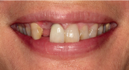La paciente presenta un provisional removible y el tejido blando circundante a la zona de la emergencia inicial de la prótesis implantosoportada se encuentra en malas condiciones, con una pérdida de grosor importante y los restos de una fístula de tejido blando (Figuras 1-4).