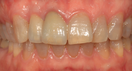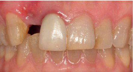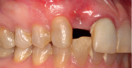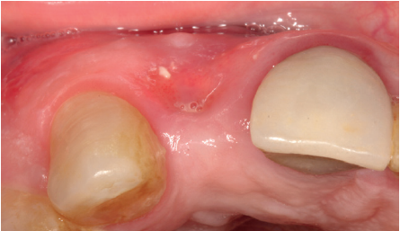 Se presenta el caso de una mujer de 36 años que acude a la consulta demandando solución para un implante situado en la posición 1.2. Este implante ha llevado una rehabilitación con una corona durante un corto período de tiempo en el que se produjo una mucositis importante y una pérdida del grosor del tejido gingival, por lo que la corona fue retirada.