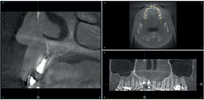 Para continuar con el estudio del caso se realiza un Cone-Beam donde poder observar tridimensional ente la posición del implante situado en posición 1.2. En los cortes seccionales se visualiza completamente situado hacia vestibular con una reabsorción casi completa de la cortical ósea de esta área, lo que explica los problemas de tejido blando subyacente. En la radiografía periapical se observa la posición del implante con respecto a los dientes adyacentes